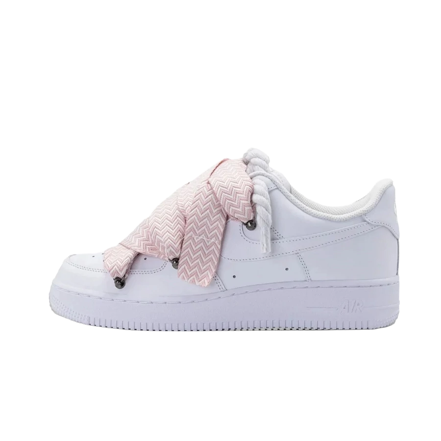 A Nike Air Force 1 Low ‘07 White / Lanvin Pink Rope a klasszikus fehér stílust frissíti modern, feltűnő részletekkel. A prémium bőr felsőrész tiszta, letisztult megjelenést biztosít, míg a rózsaszín „rope” fűzők különleges, luxus érzetet adnak. A legendás Air talpbetét puha párnázást nyújt, így tökéletes választás mindennapi viselethez és stílusos streetwear összeállításokhoz.